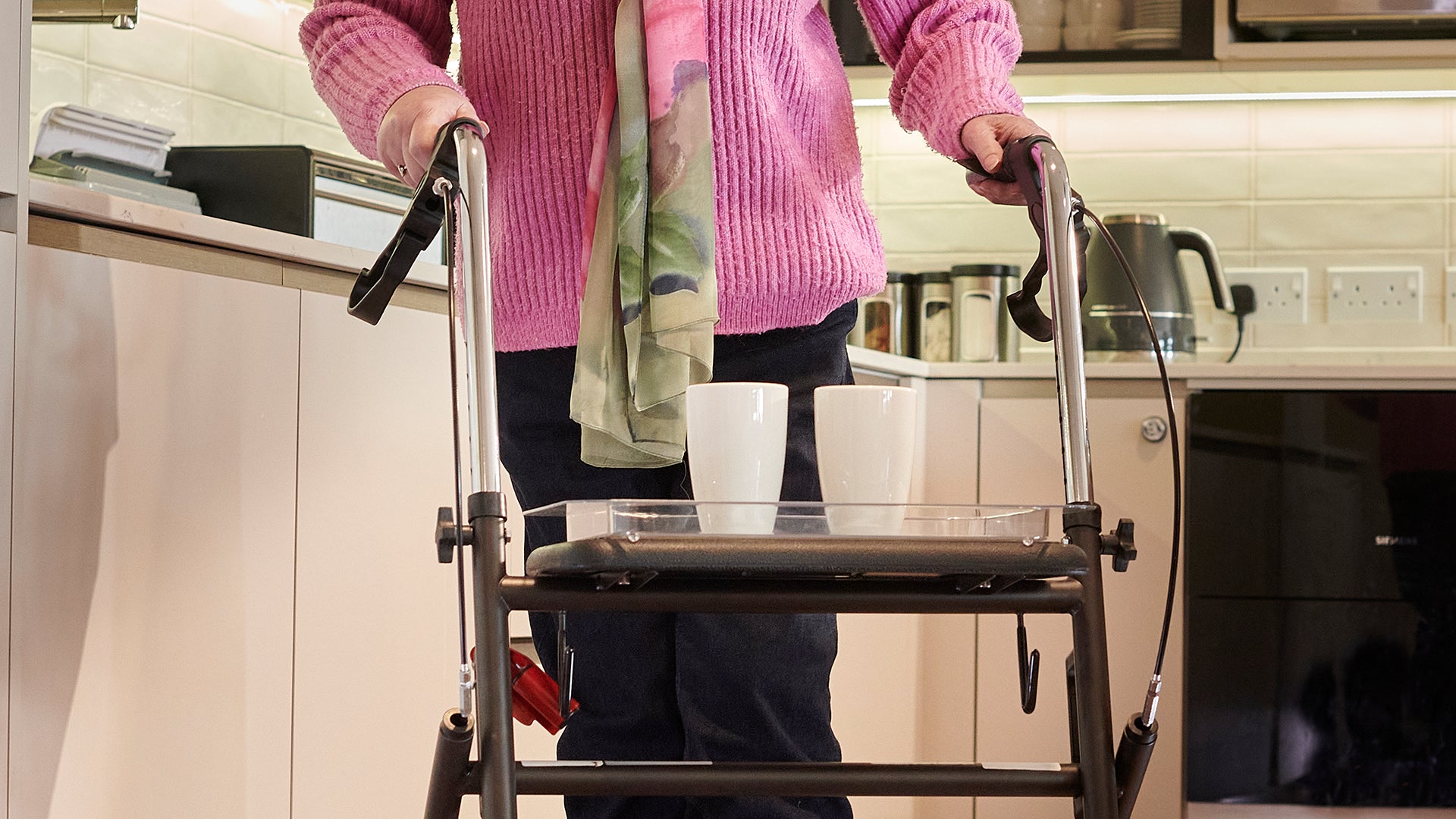 The walker comes equipped with a large shopping basket, a sturdy seat, and a practical tray, making it perfect for errands or resting on the go. Its height-adjustable frame ensures a personalized fit, while the sleek gun metal grey finish adds a modern touch.